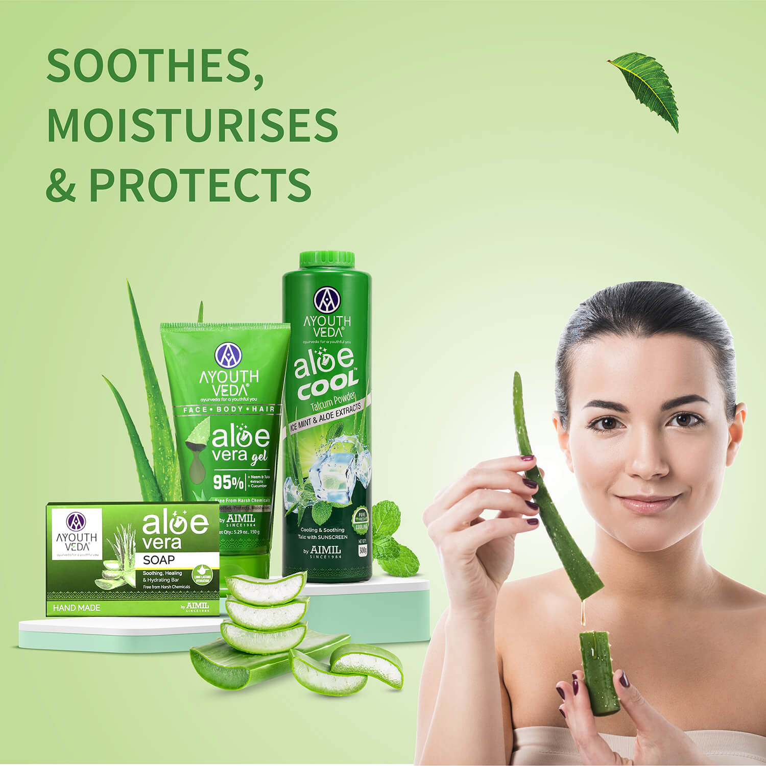 Ayouthveda Aloe Vera Combo is a triad of skin-loving essentials enriched with the goodness of Aloe vera and diverse botanicals, offering a multitude of benefits to your skin, ensuring a radiant and rejuvenated look. Firstly, indulge in the gentle nourishment of the Aloe bathing bar, providing gentle yet effective cleansing while maintaining your skin's natural moisture balance. Feel the cooling effect of Menthol as it refreshes and soothes your skin, while its potent anti-inflammatory properties protect against irritation. Then, discover the versatility of nourishing Aloe gel, packed with 95% pure Aloe vera extracts; it works to reduce inflammation, redness, and dryness while also safeguarding your skin from environmental pollutants. Complete the trio with Aloe talc, offering immediate cooling relief and neutralizing unwanted body odor, while shielding your skin from harmful sun exposure. Embrace the comfort and confidence your revitalized skin deserves by trying the Ayouthveda Aloe Vera Combo.!