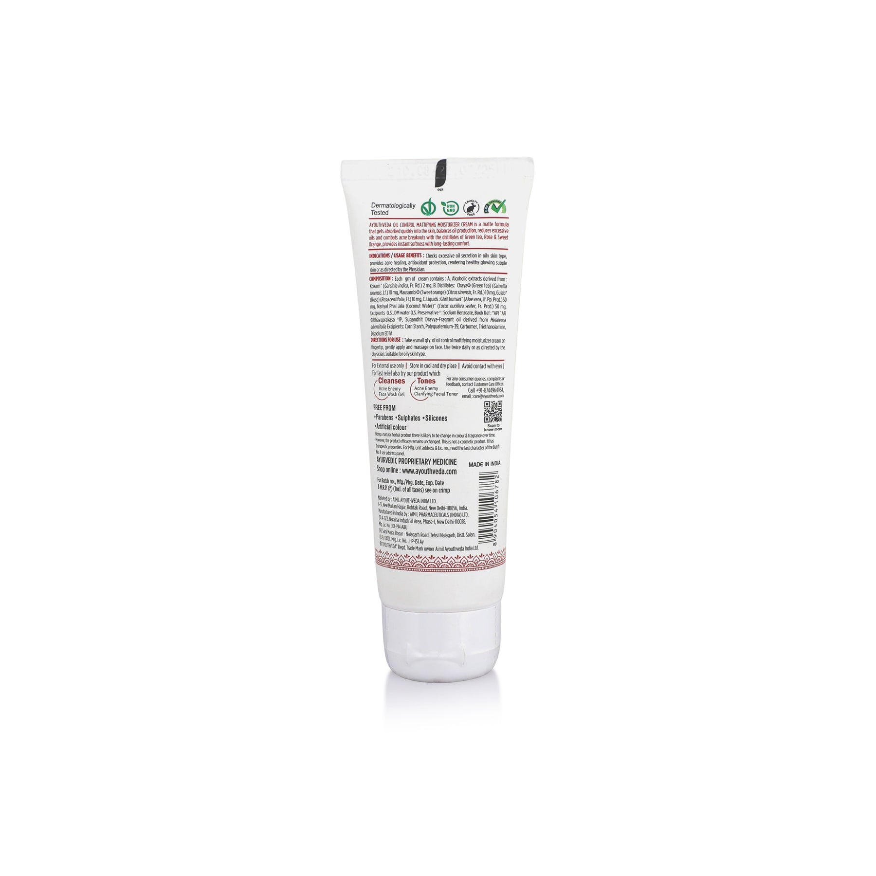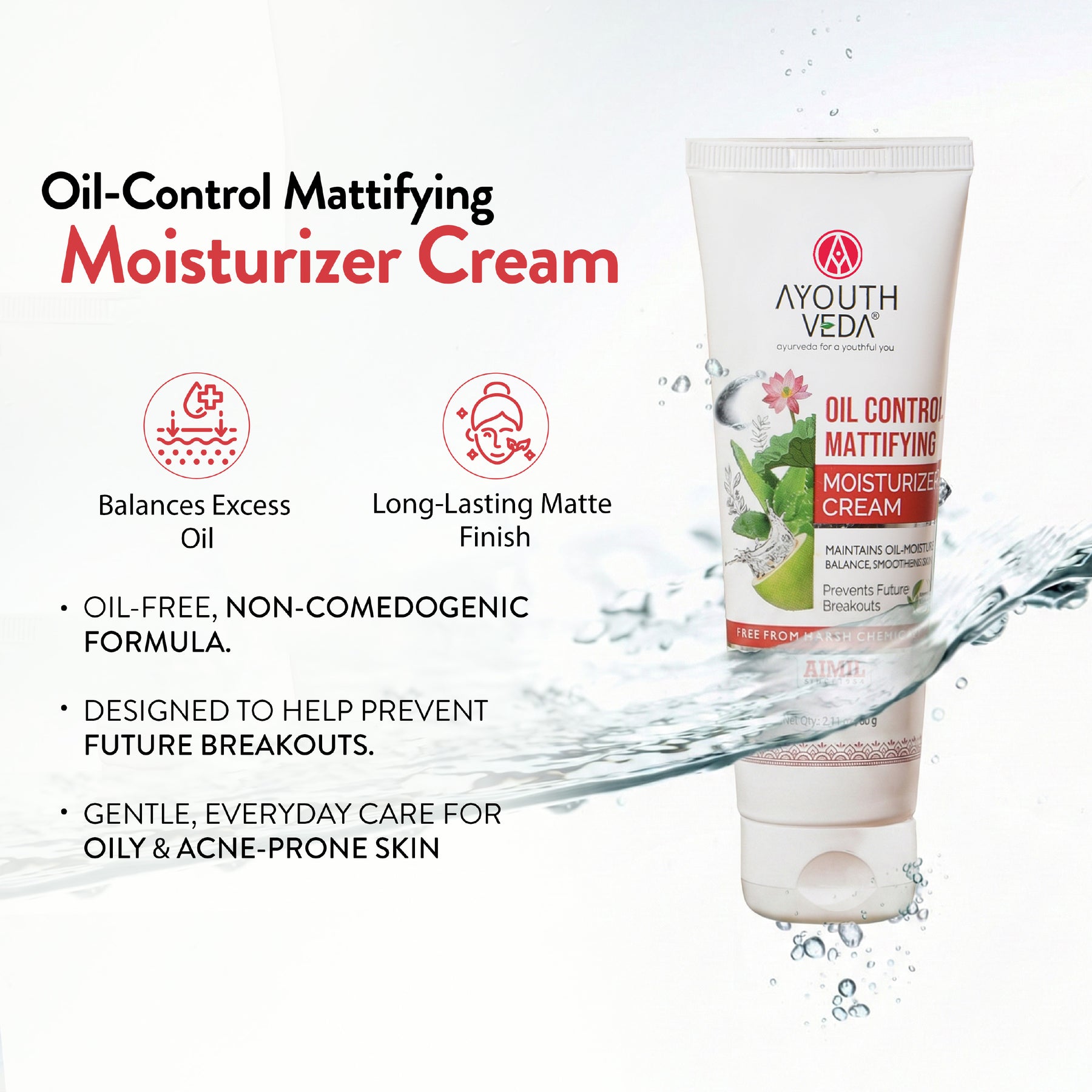 Ayouthveda Oil Control Mattifying Moisturizer Cream is specially formulated to help balance oil production, and deeply nourish oily skin. Infused with the goodness of Green tea, Rose, and Sweet Orange, it provides instant softness with long-lasting oil-free comfort. Its unique formula contains Kokum which delivers specific anti-infective benefits to target acne-prone skin. Enriched with fresh Aloe Vera pulp and Coconut water, it provides daily refreshment packed with vitamins and antioxidants. It is perfect for anyone looking for a non-greasy, oil control cream that keeps their skin moisturized and healthy.