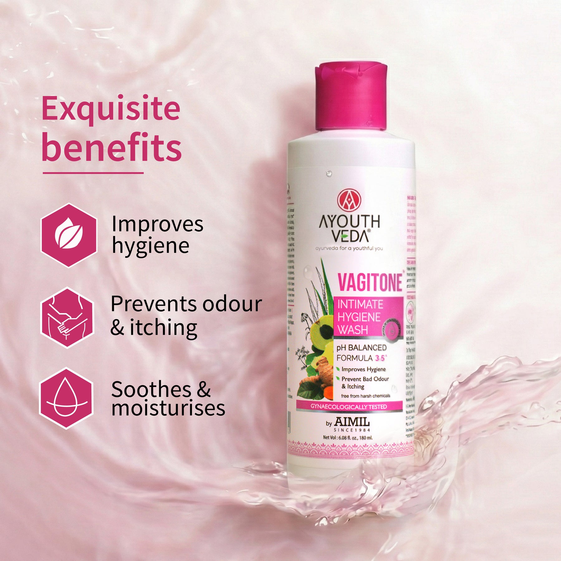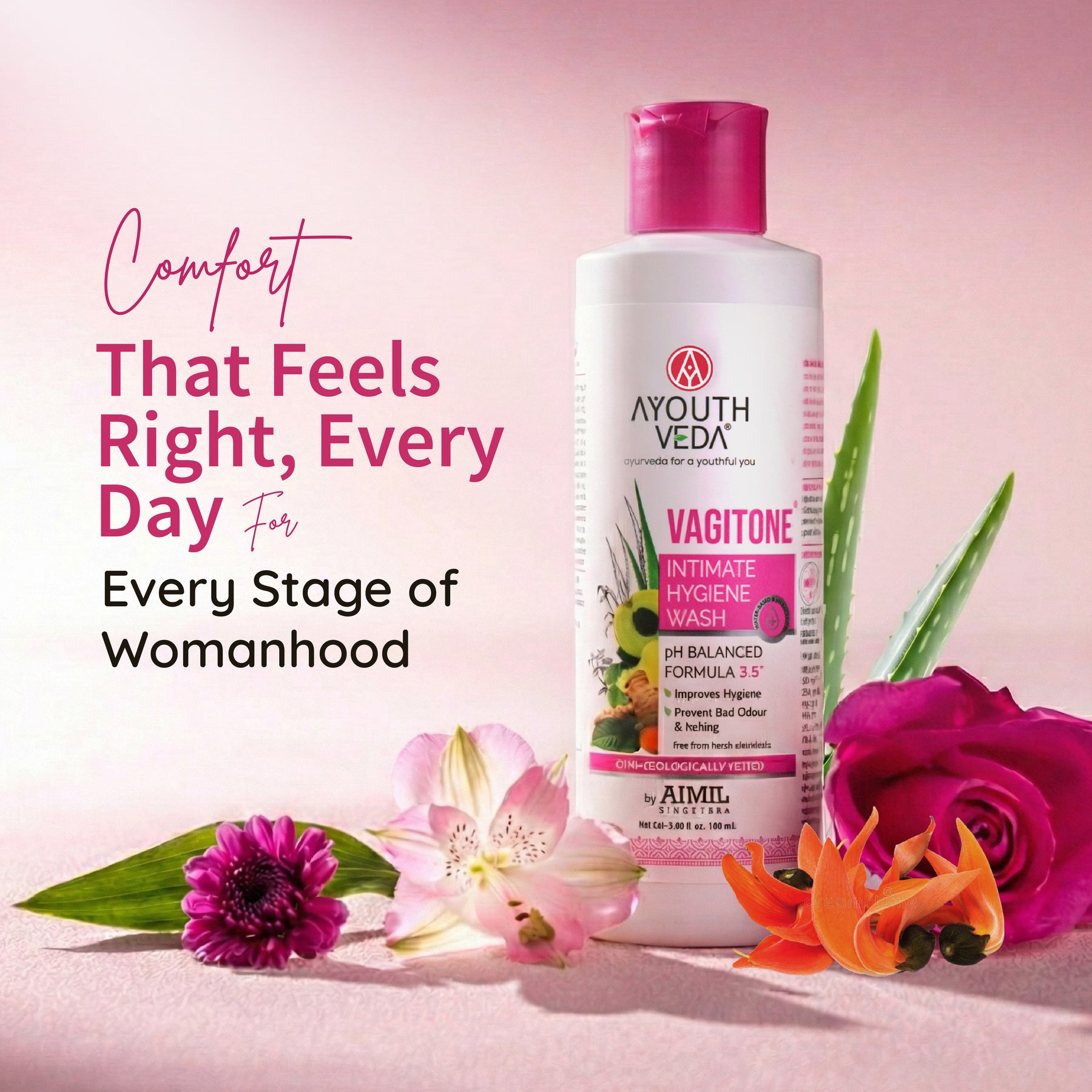 Ayouthveda Vagitone Intimate Hygiene Wash is an exceptional choice for maintaining intimate hygiene. Its sulfate-free formula, enriched with natural botanicals, ensures a perfect balance of healthy bacteria while eliminating bad bacteria. The presence of Sphatica, green tea, and Aloe vera maintains the pH balance naturally, preventing vaginal dryness. This hormone-free formula, fortified with eight anti-infective botanicals, including Curcuma longa (Haridra), helps combat bacterial and repeated infections, improving overall vaginal hygiene. It comes with the calming & soothing essence of Butea that nullifies bad odor & maintains healthy flora thereby making you feel better, soon after application. Use Ayouthveda Vagitone Intimate Hygiene Wash confidently to experience a refreshing, natural clean feeling every day!